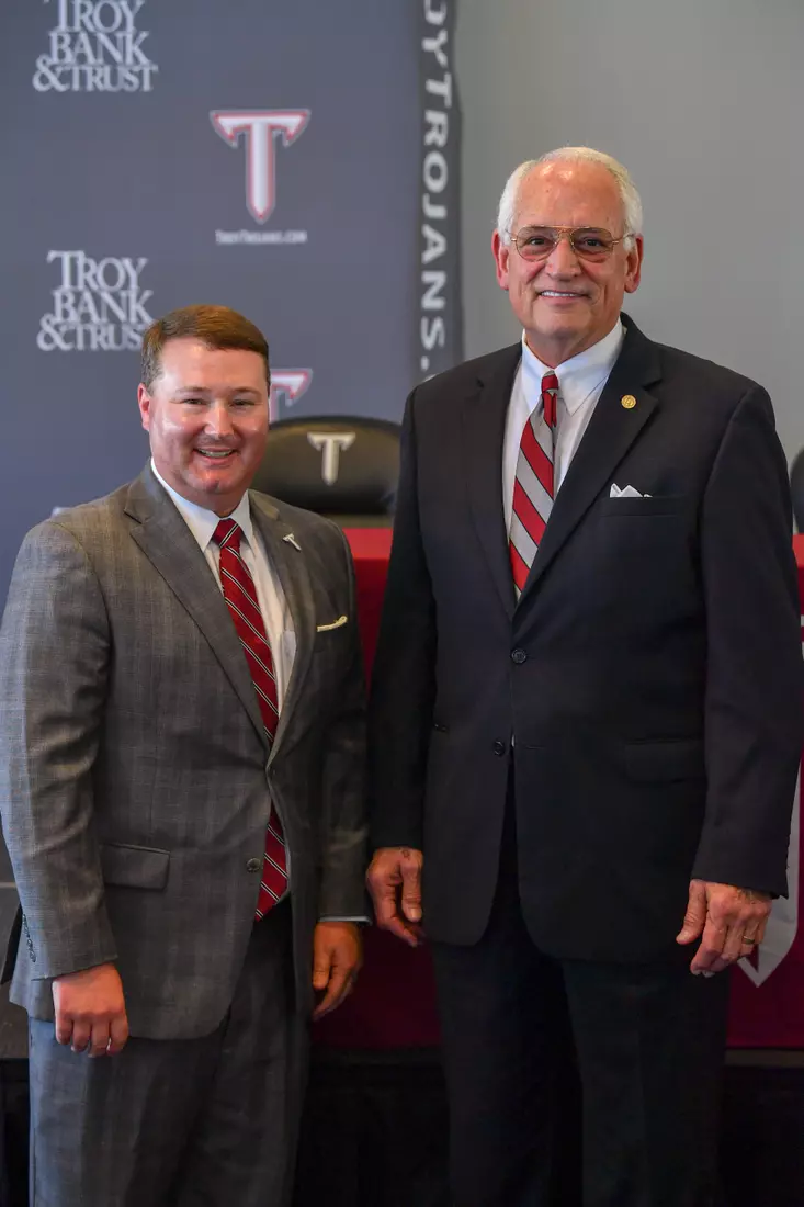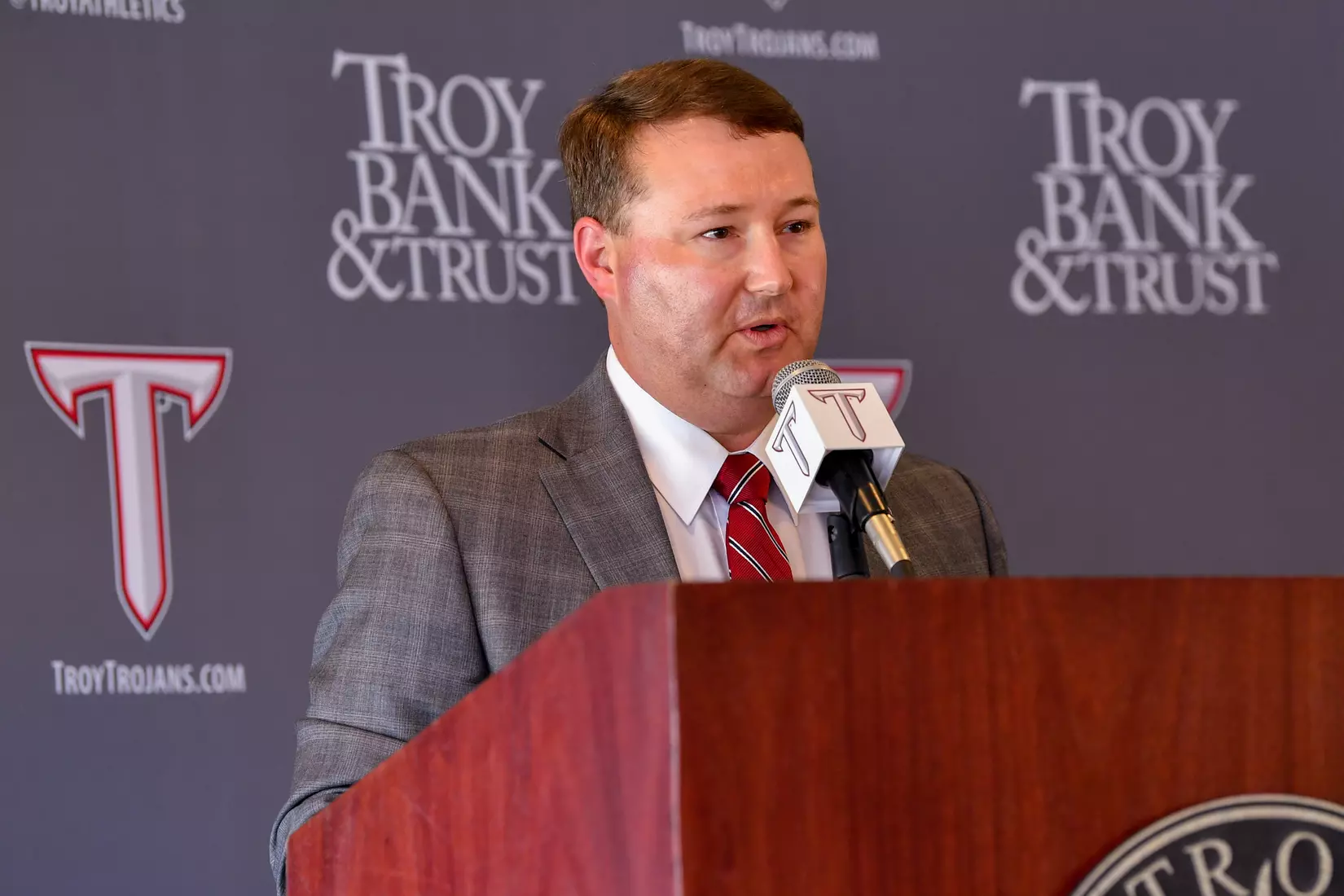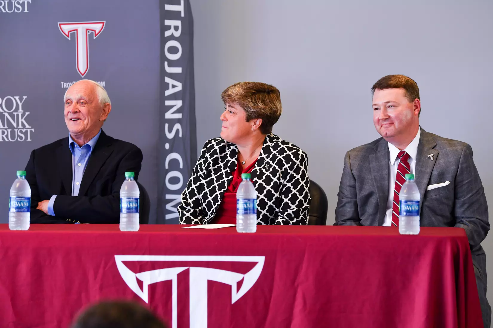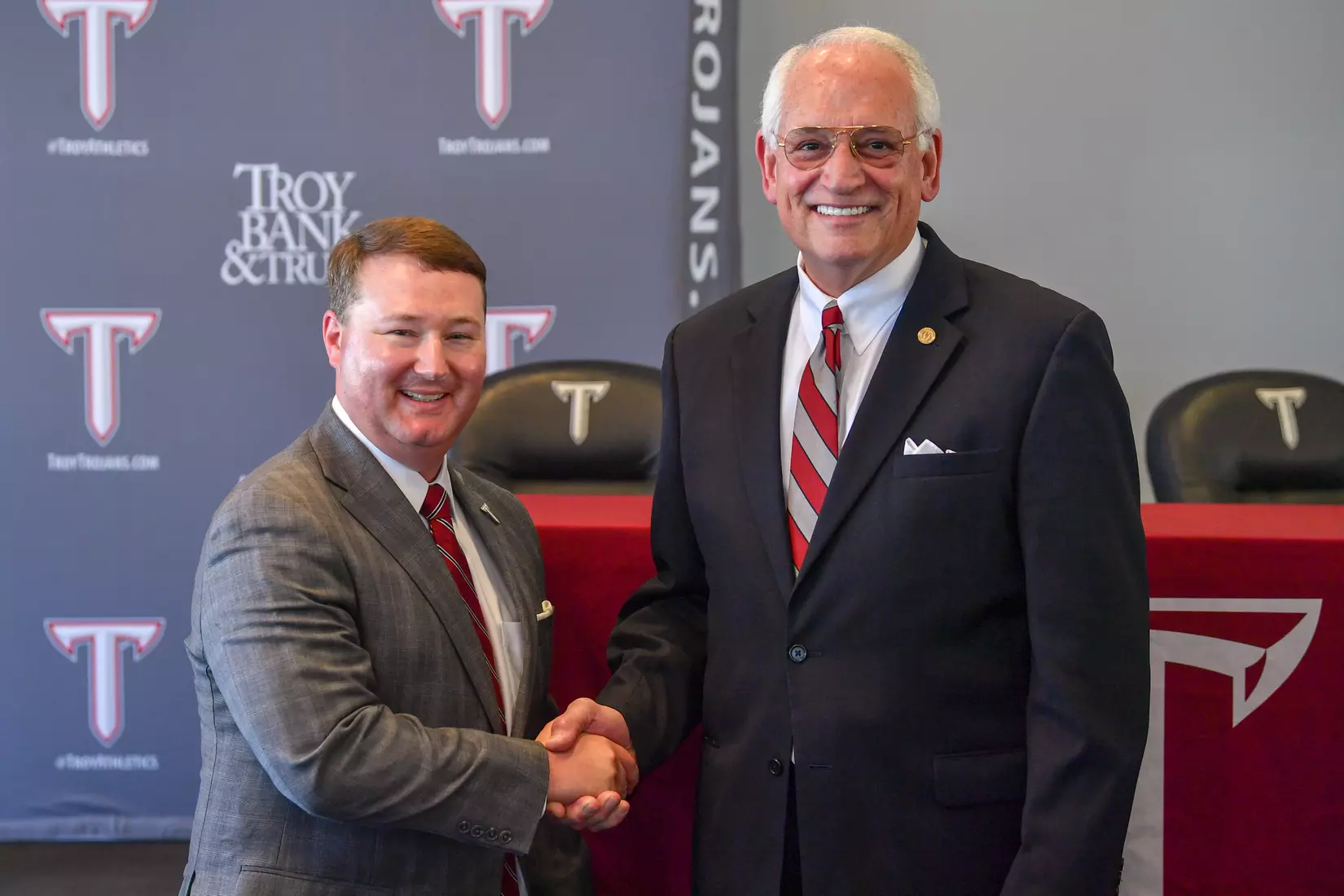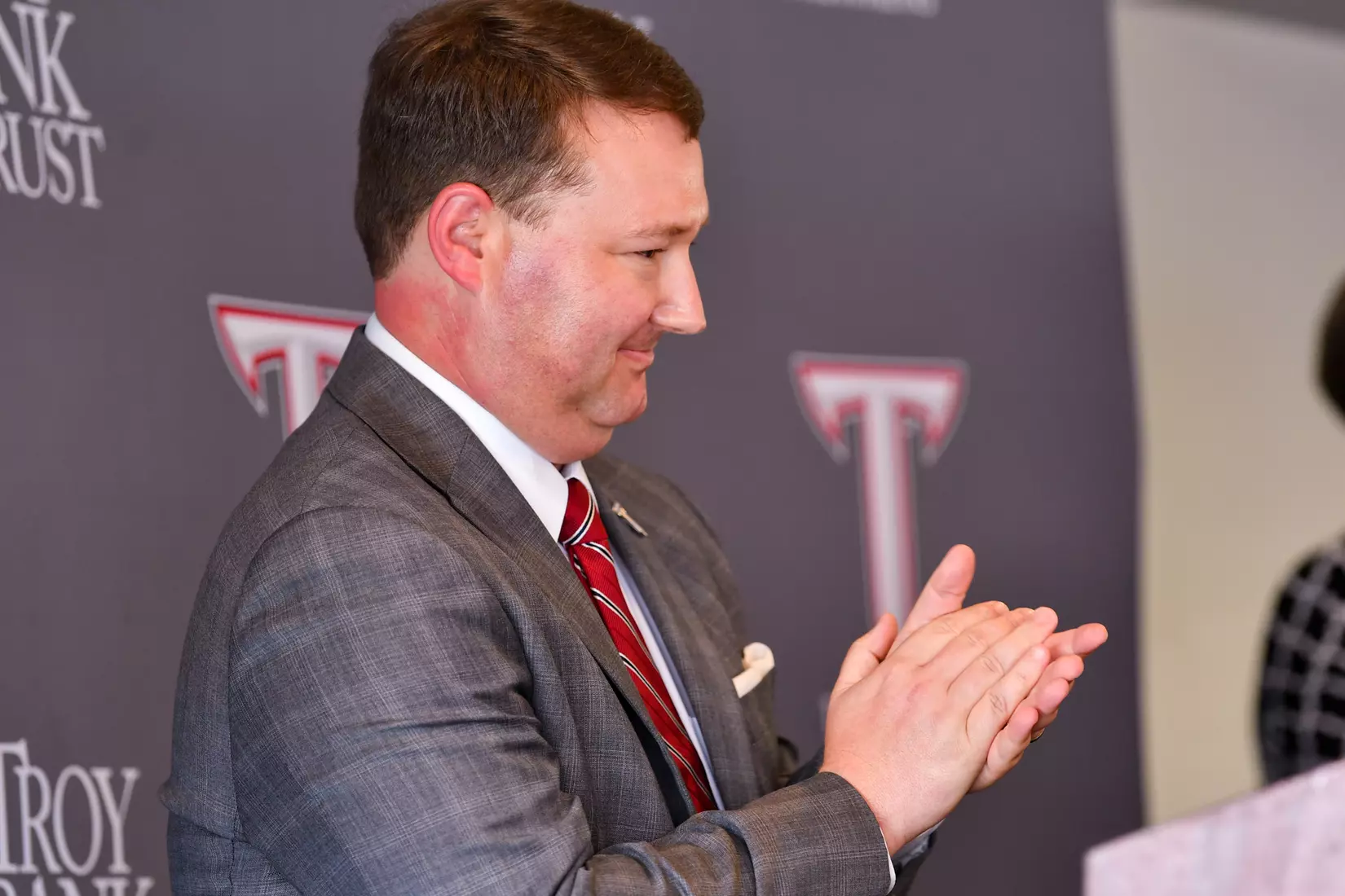 TROY, Alabama – Brent Jones was introduced as Troy University's new Director of Athletics following a two-year stint as Troy's Deputy Director of Athletics for External Operations, Troy University Chancellor Dr. Jack Hawkins, Jr., announced at a press conference Wednesday afternoon.
