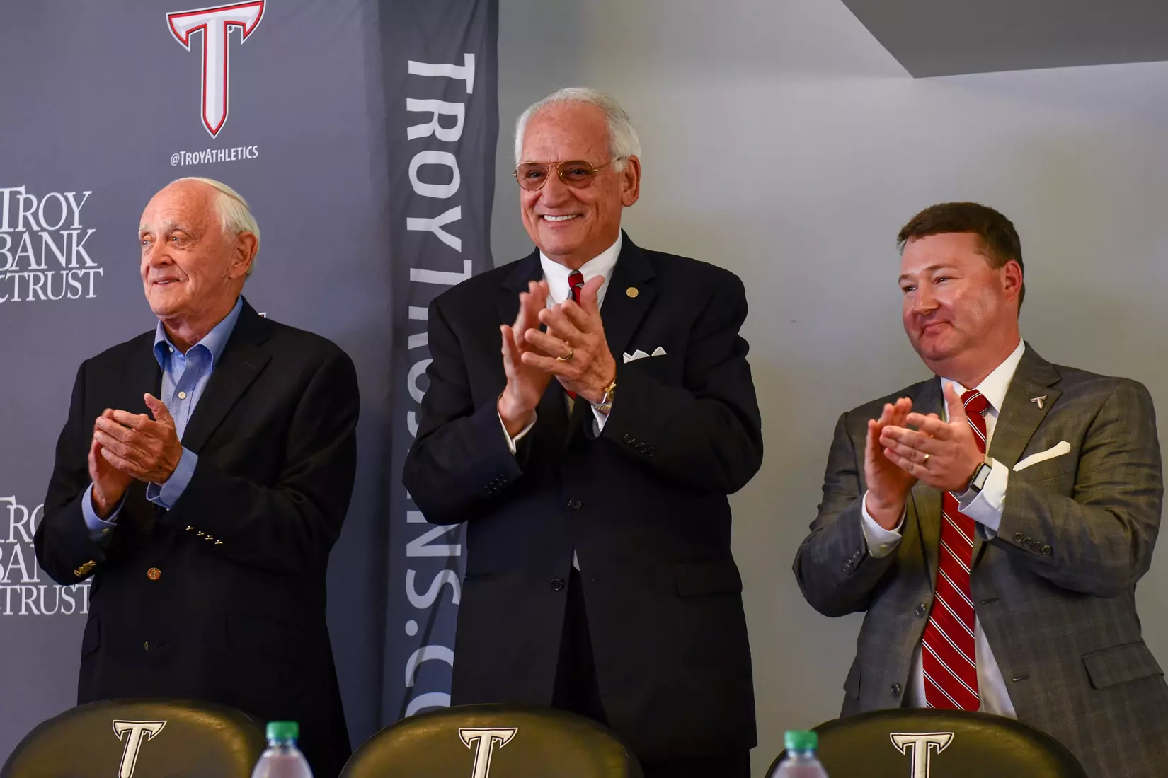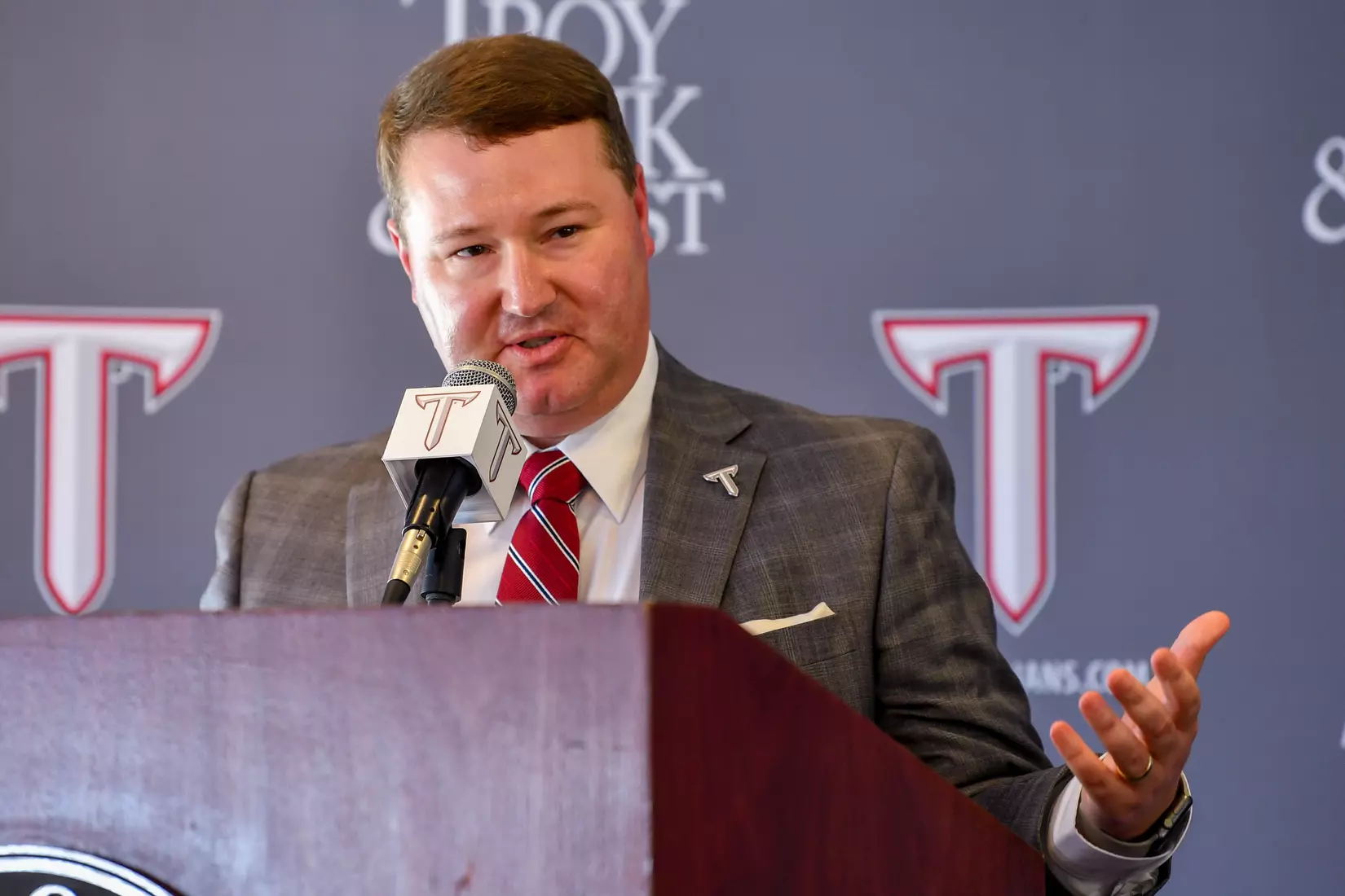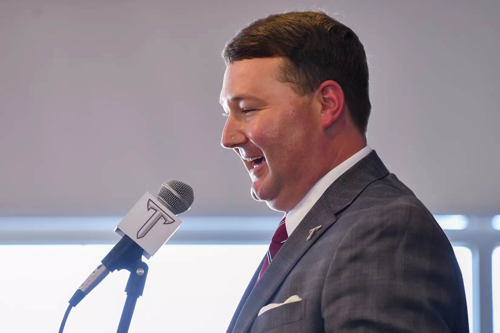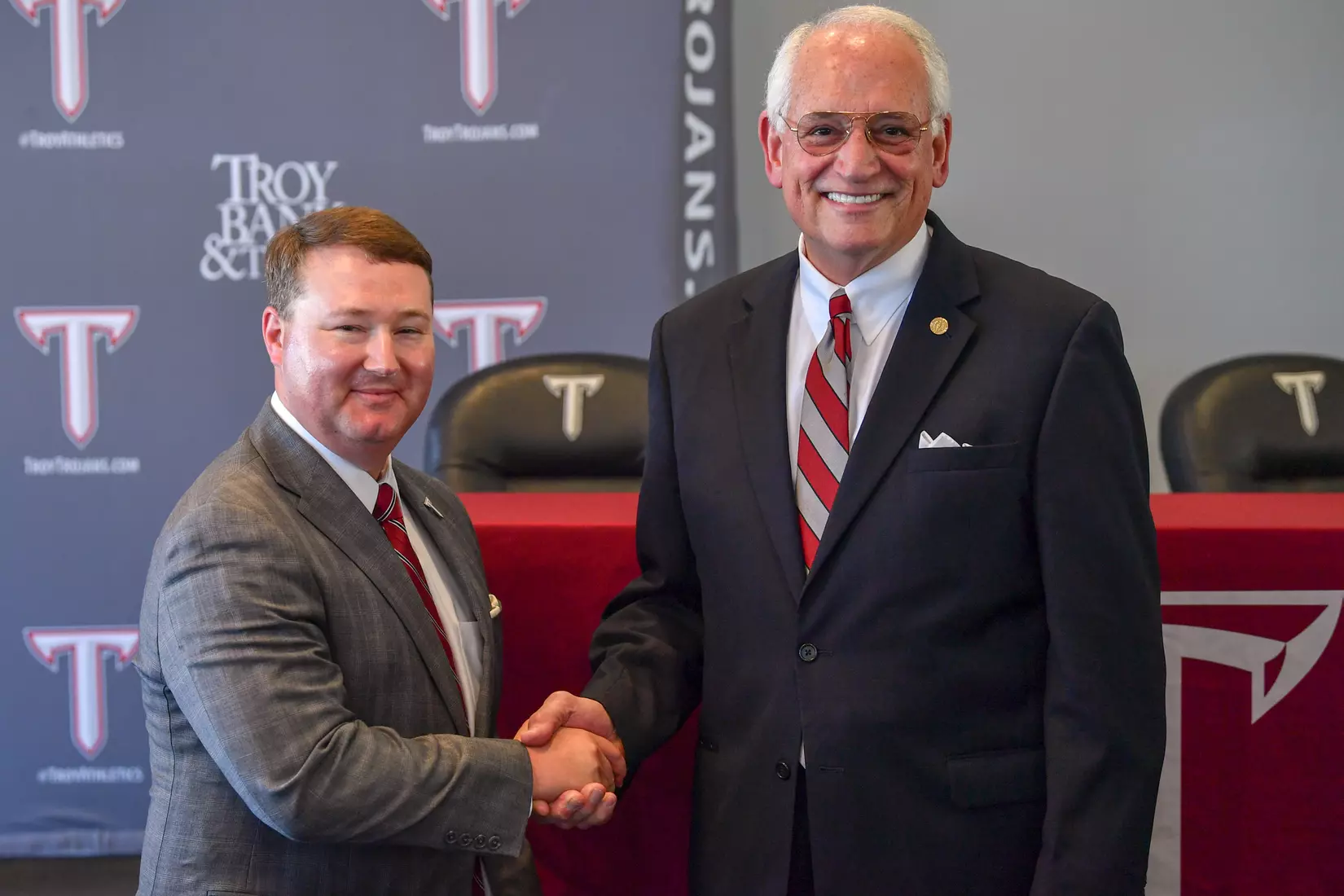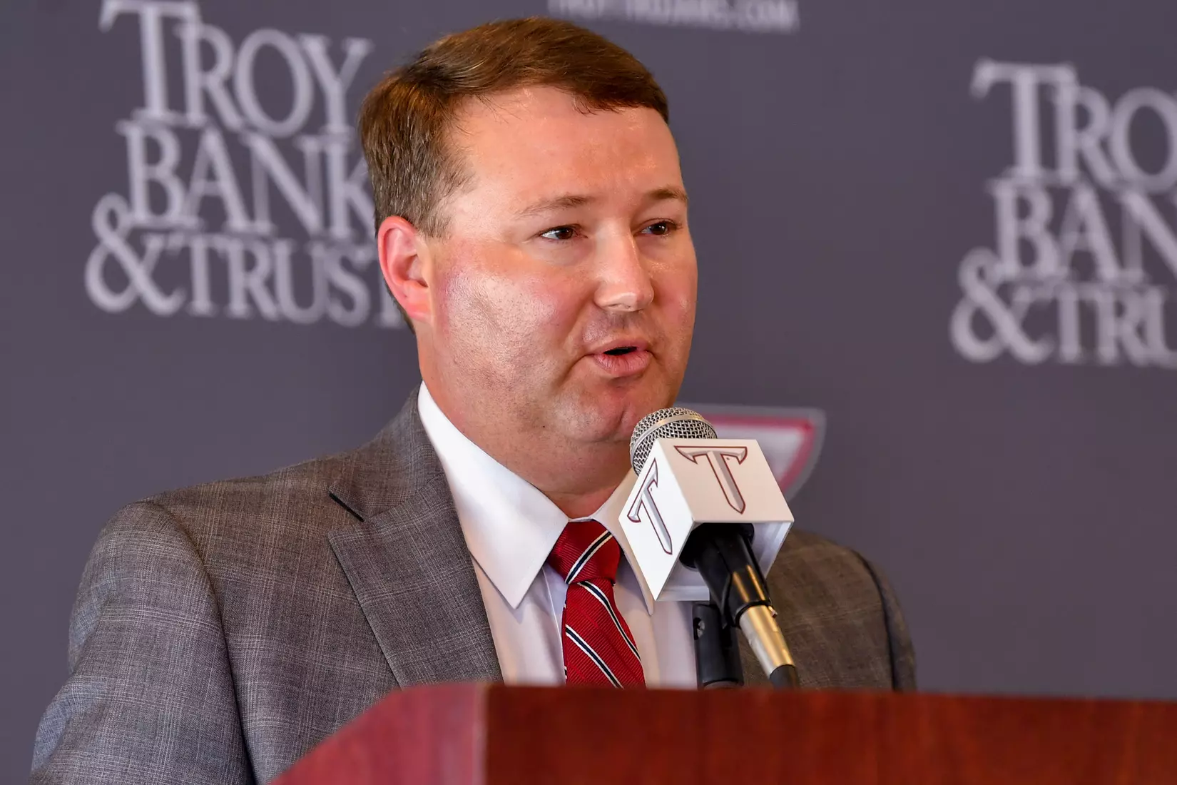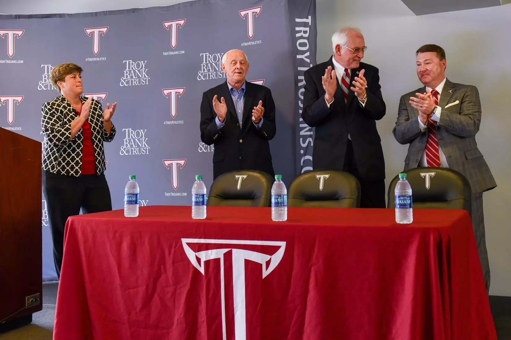 TROY, Alabama – Brent Jones was introduced as Troy University's new Director of Athletics following a two-year stint as Troy's Deputy Director of Athletics for External Operations, Troy University Chancellor Dr. Jack Hawkins, Jr., announced at a press conference Wednesday afternoon.