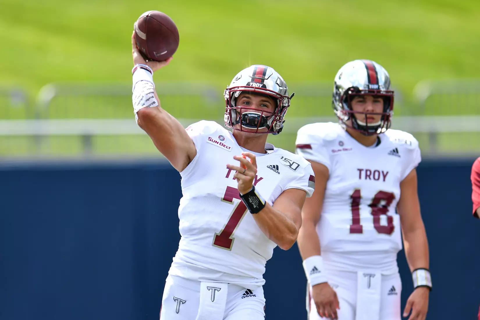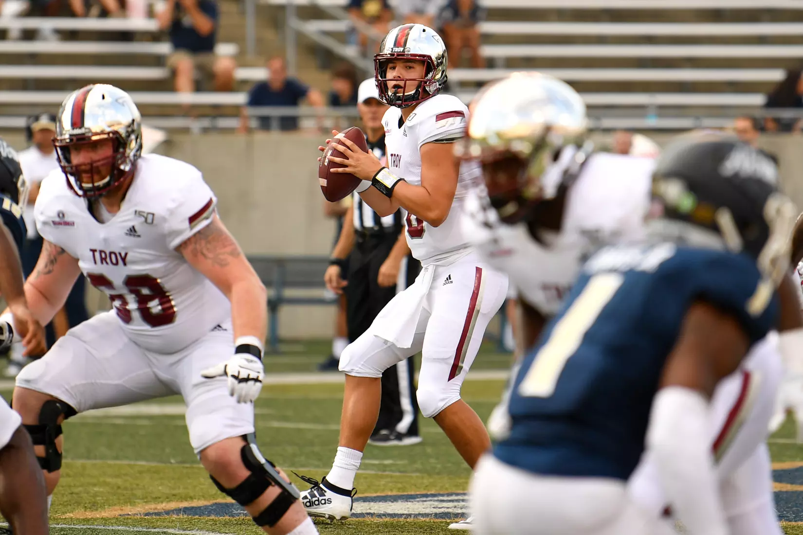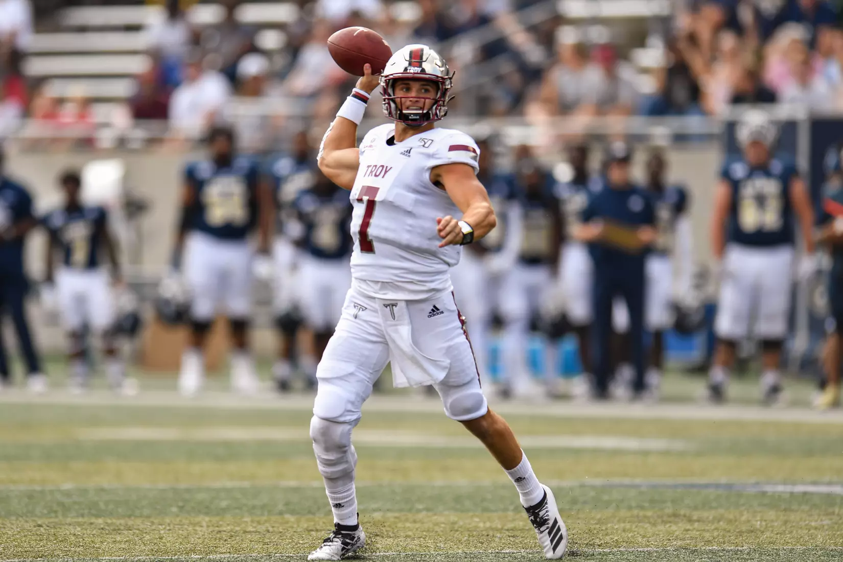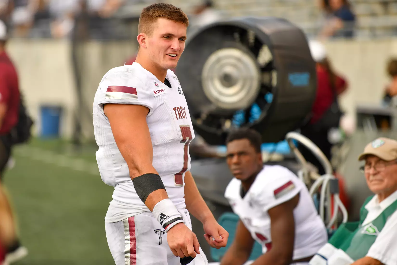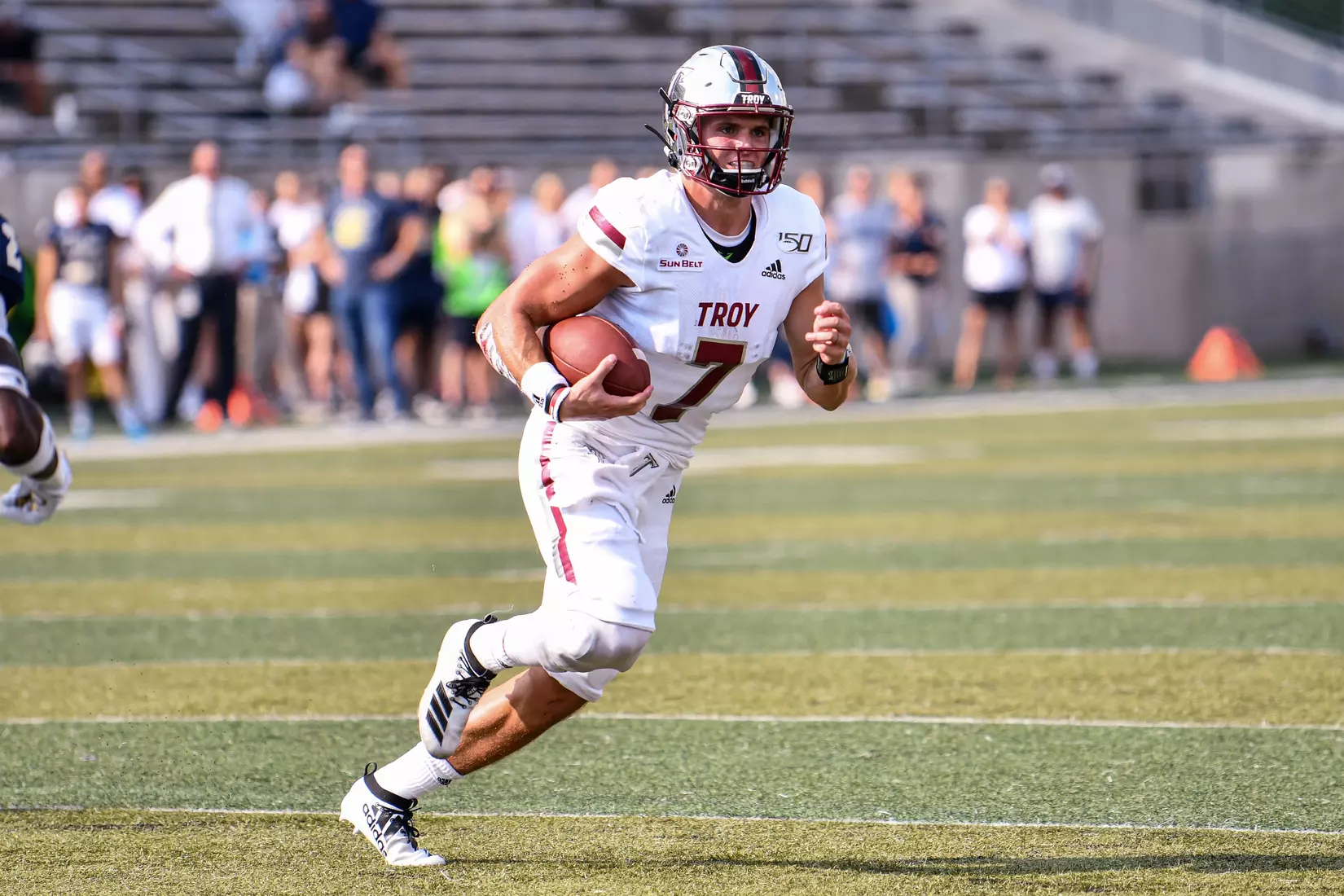 Troy (2-1) broke the game open in the second quarter with a pair of touchdowns – a 2-yard pass from Barker to Khalil McClain and a 9-yard run by Barker – to start a run of 28-straight points by the Trojans to end the game.