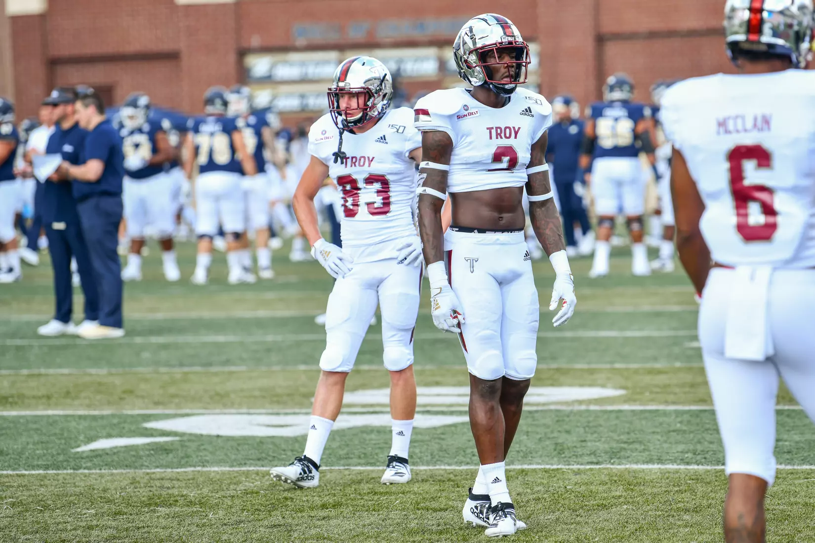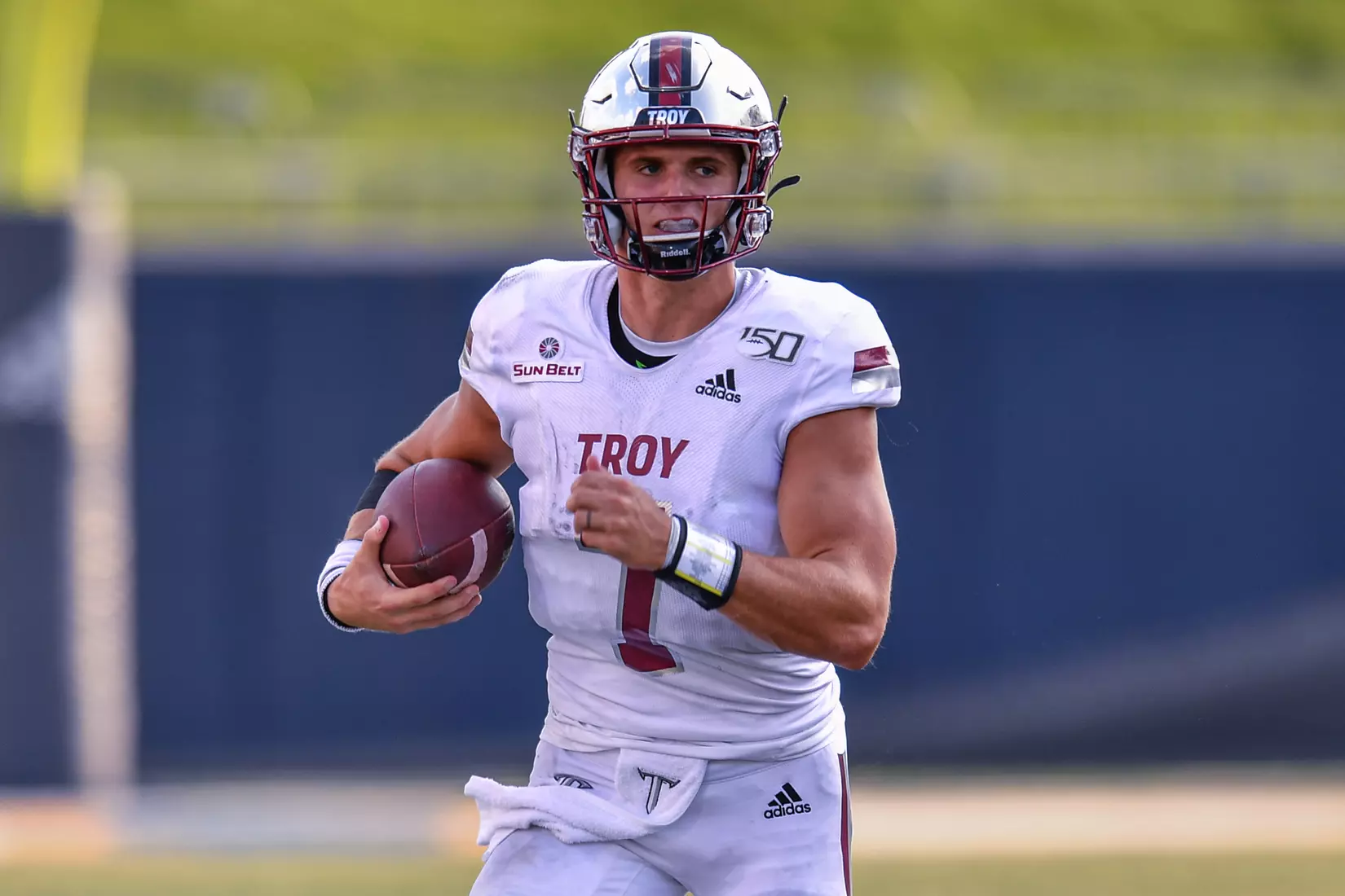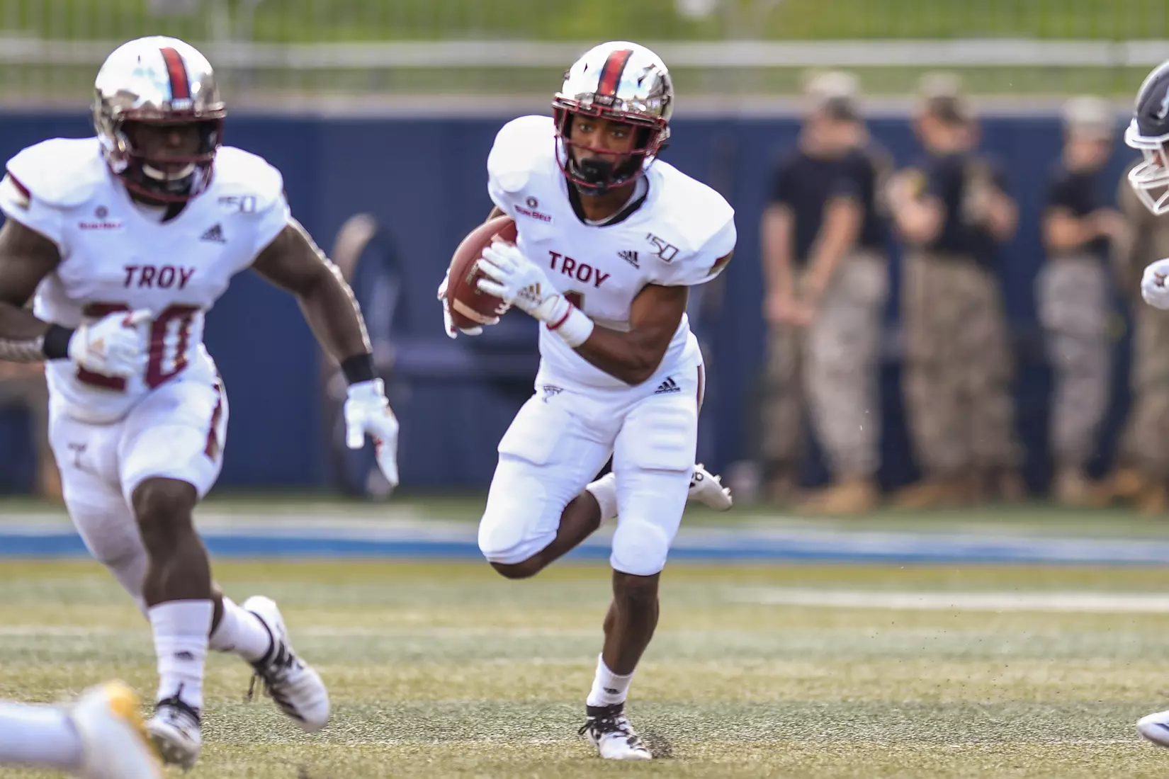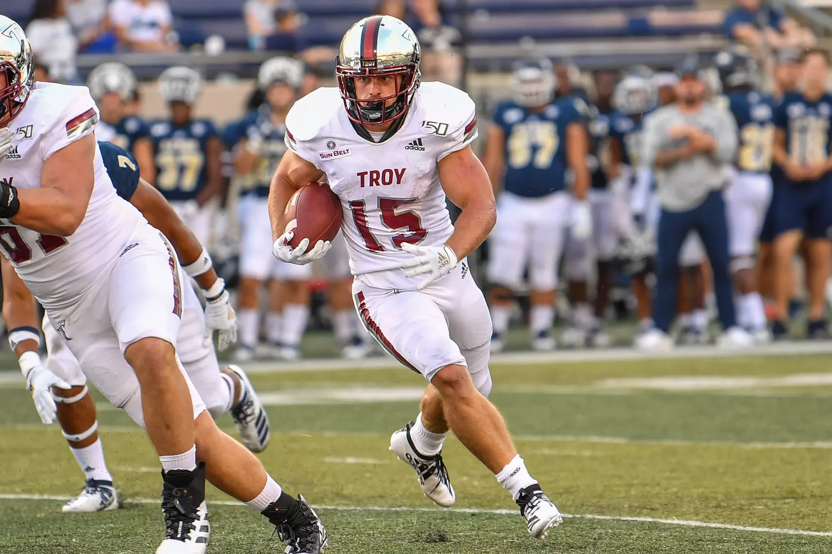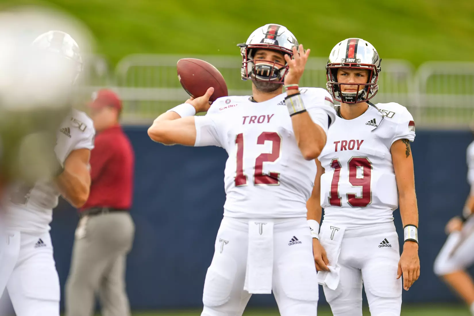 Troy (2-1) broke the game open in the second quarter with a pair of touchdowns – a 2-yard pass from Barker to Khalil McClain and a 9-yard run by Barker – to start a run of 28-straight points by the Trojans to end the game.