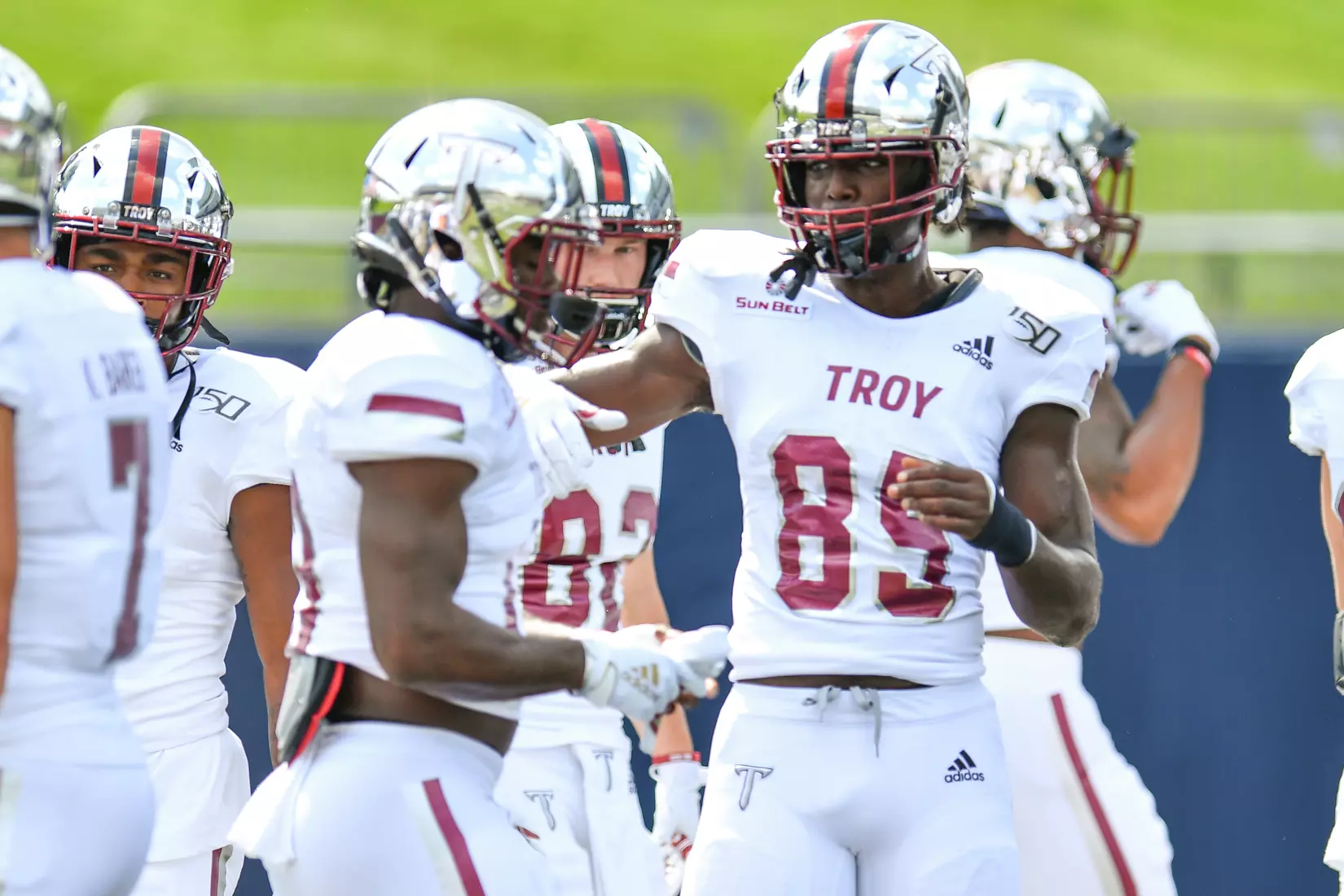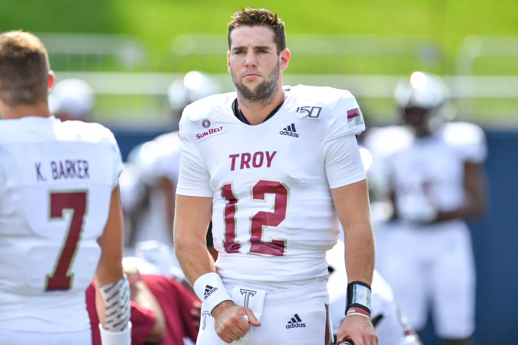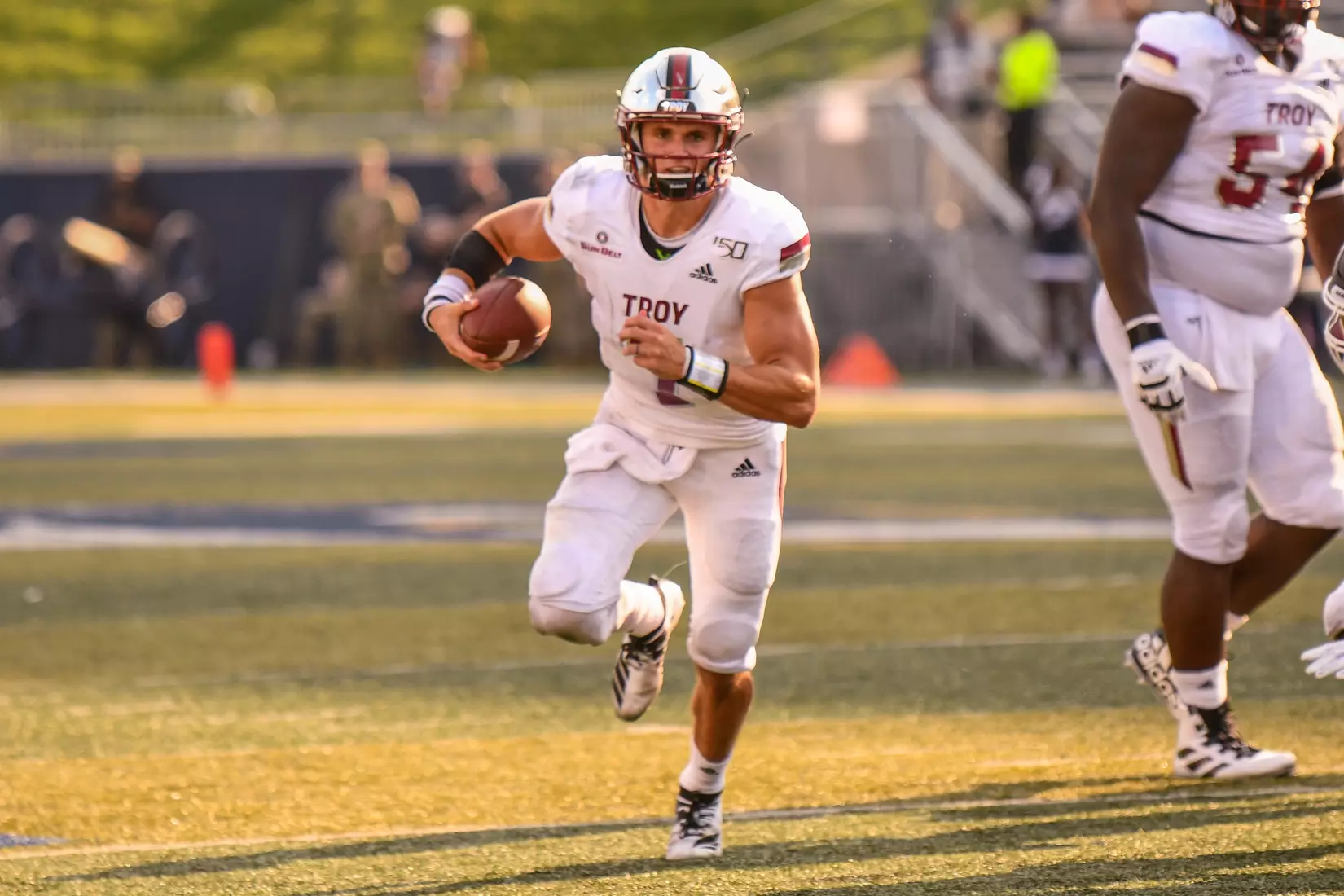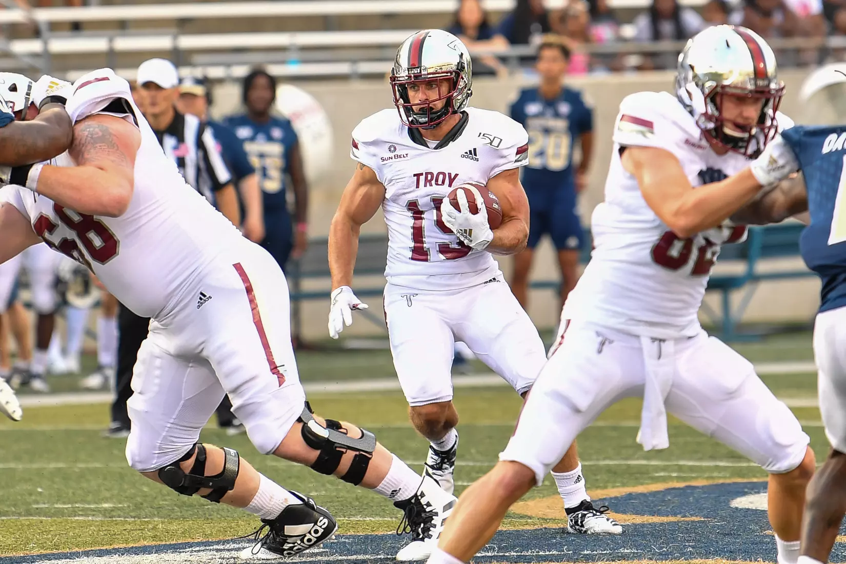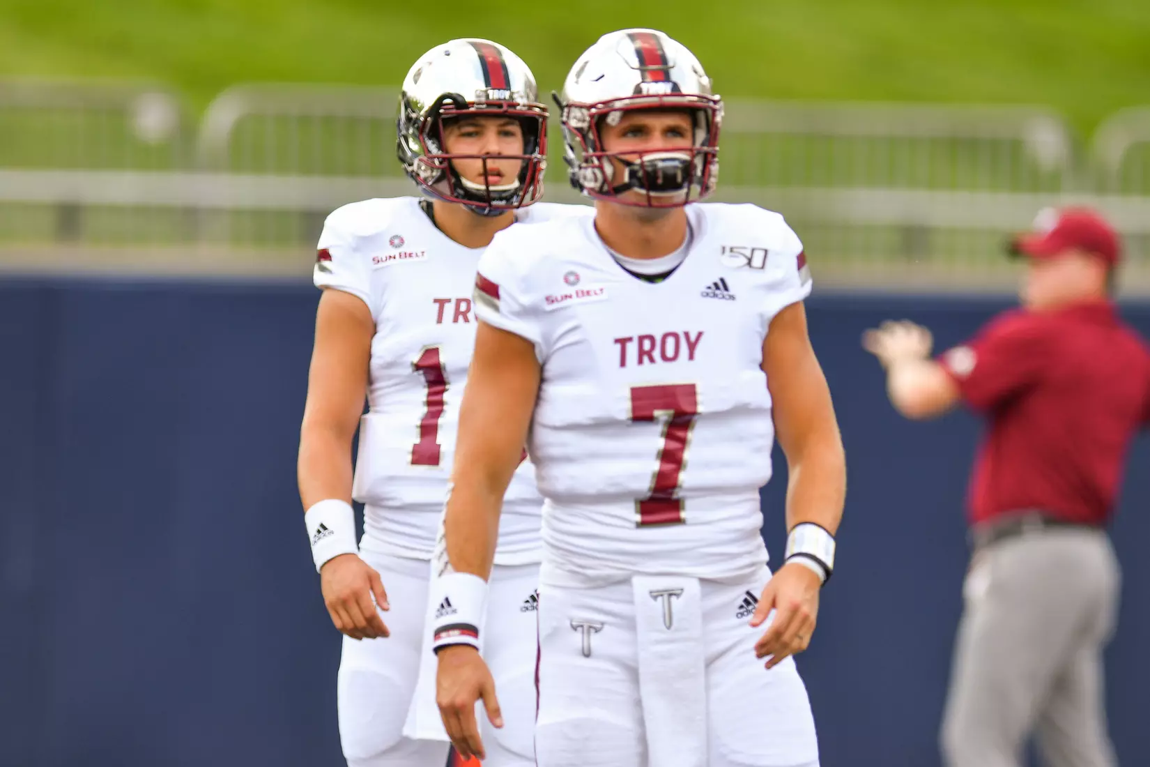 Troy (2-1) broke the game open in the second quarter with a pair of touchdowns – a 2-yard pass from Barker to Khalil McClain and a 9-yard run by Barker – to start a run of 28-straight points by the Trojans to end the game.