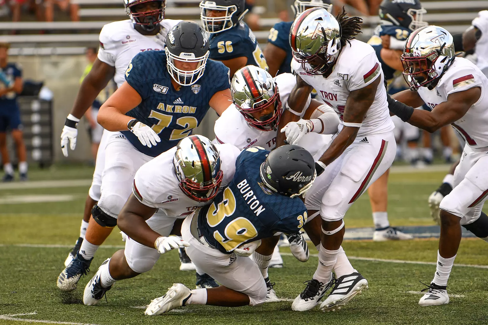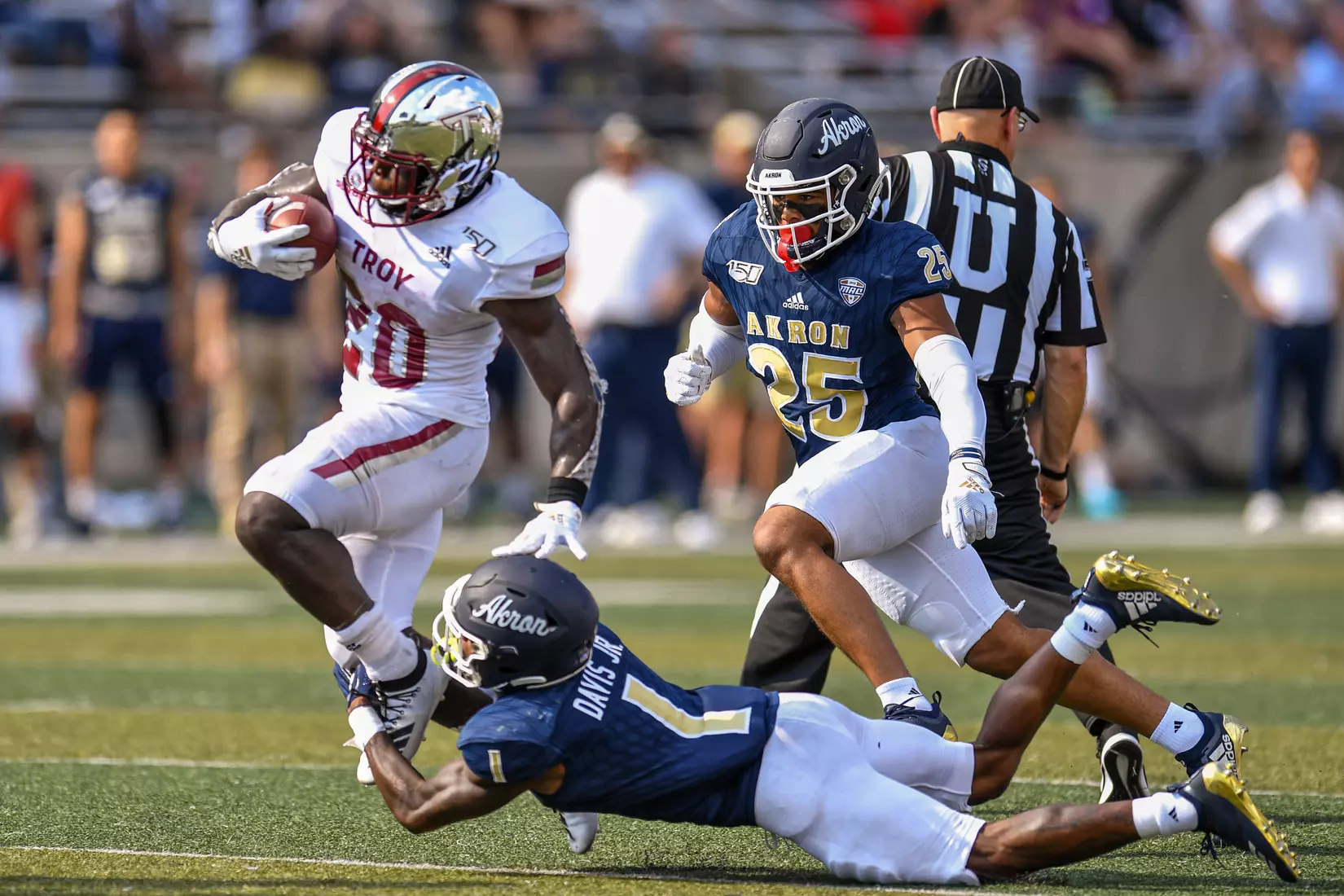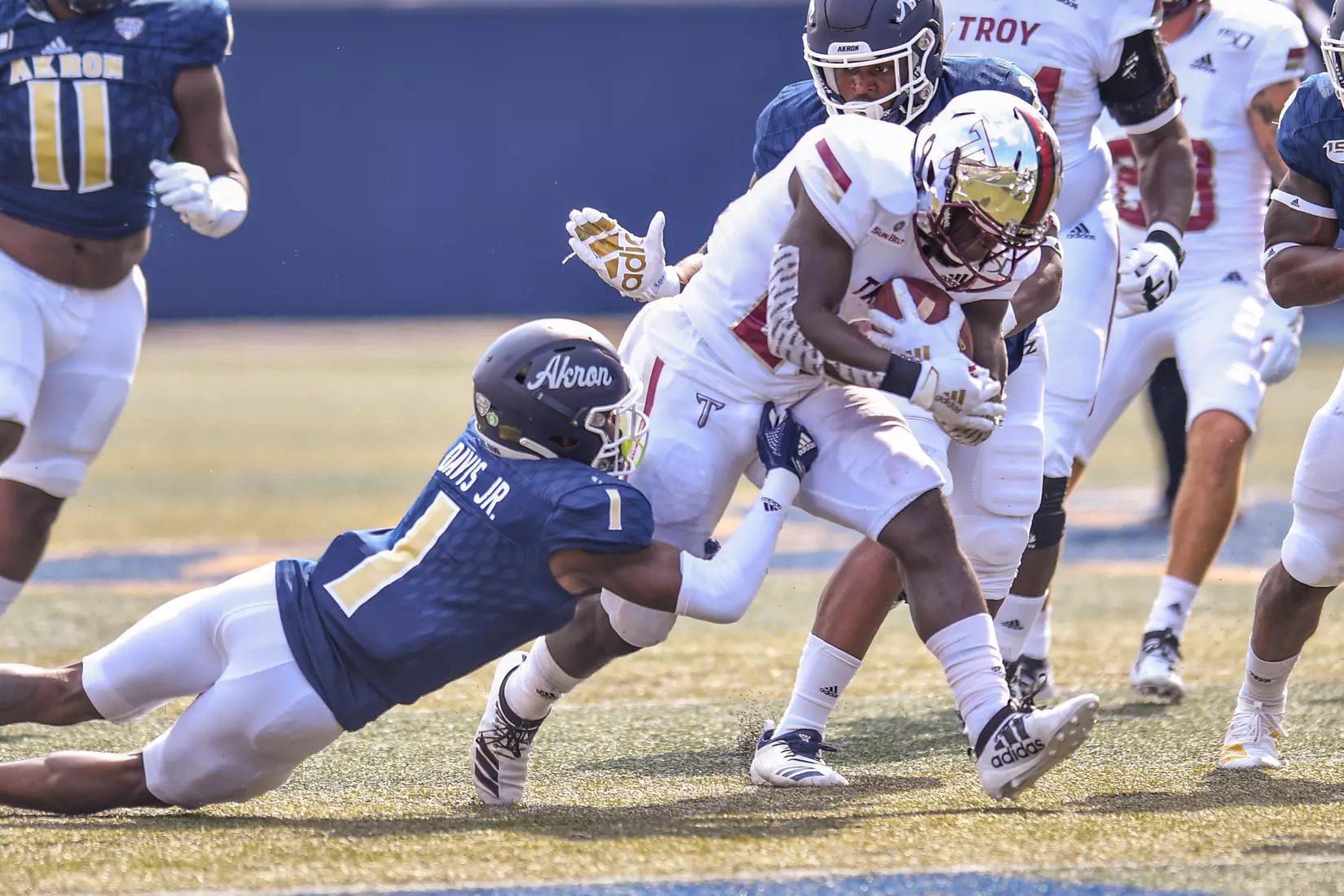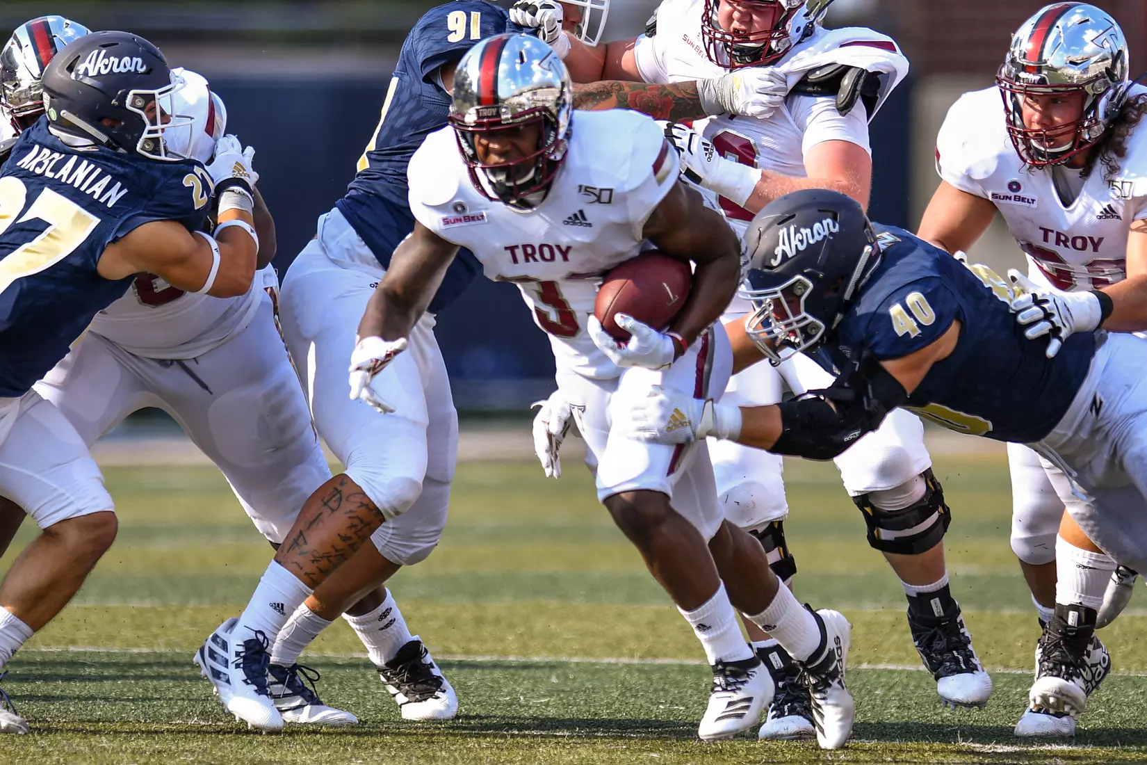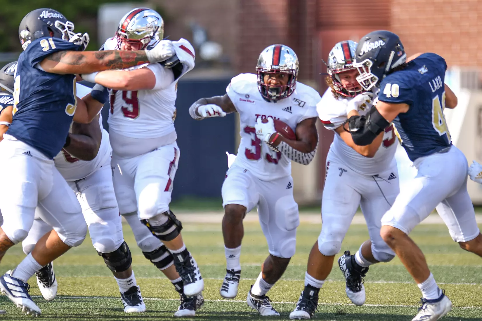 AKRON, OHIO – Kaleb Barker accounted for four touchdowns and the Troy defense limited Akron to just 242 yards as the Trojans defeated the Zips, 35-7, Saturday at InfoCision Stadium.