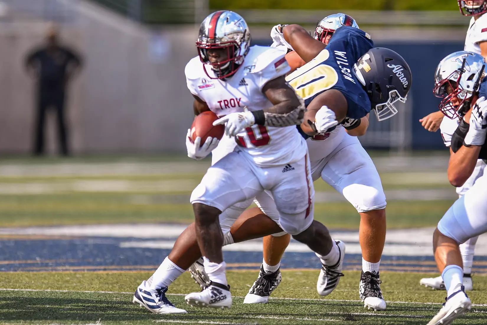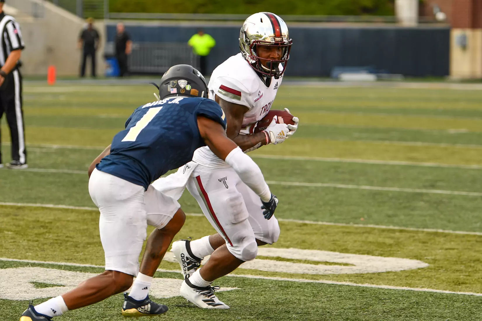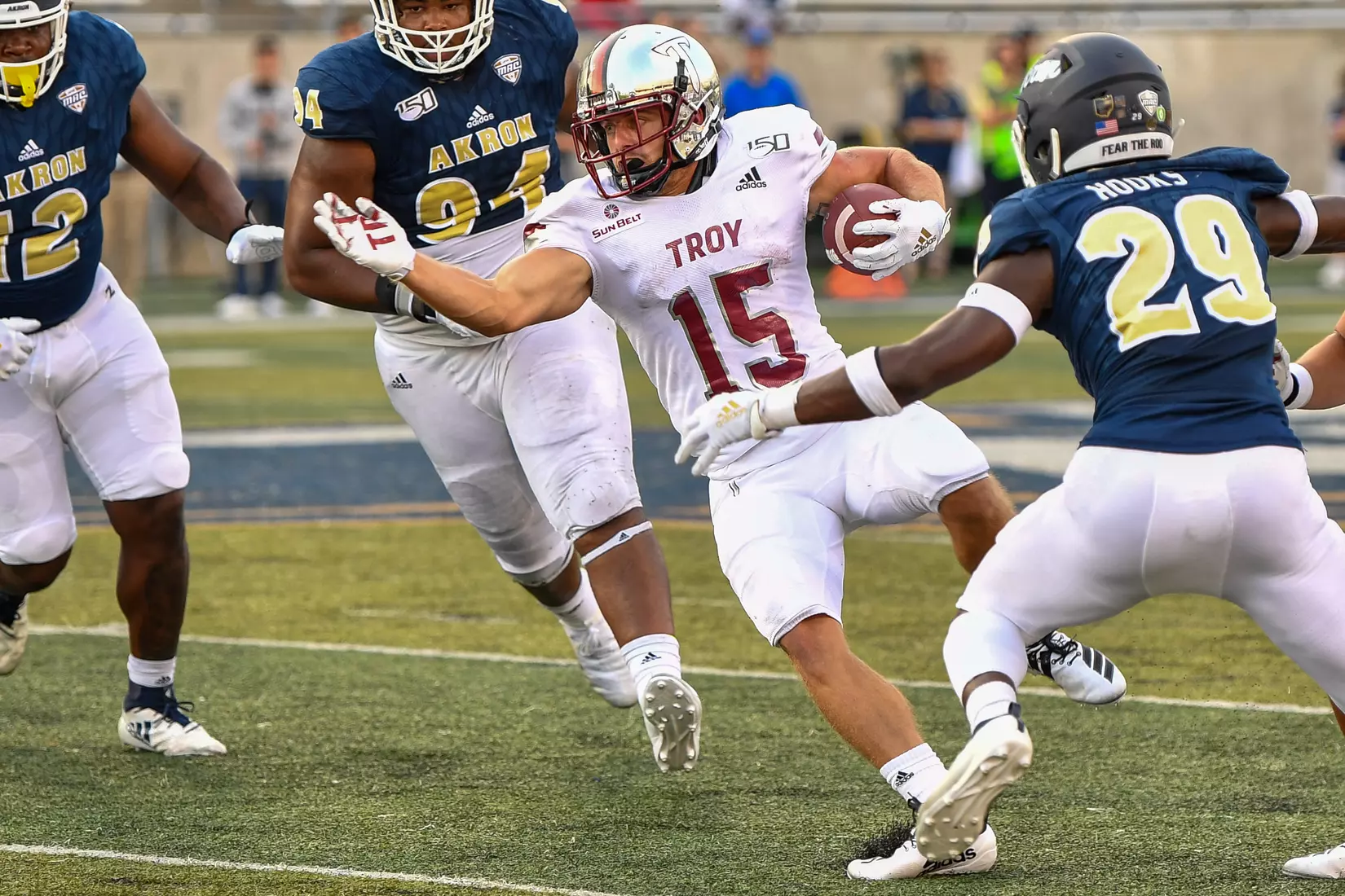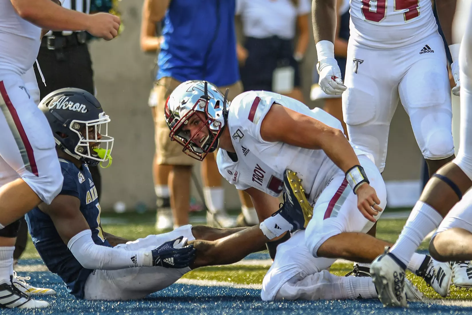 AKRON, OHIO – Kaleb Barker accounted for four touchdowns and the Troy defense limited Akron to just 242 yards as the Trojans defeated the Zips, 35-7, Saturday at InfoCision Stadium.