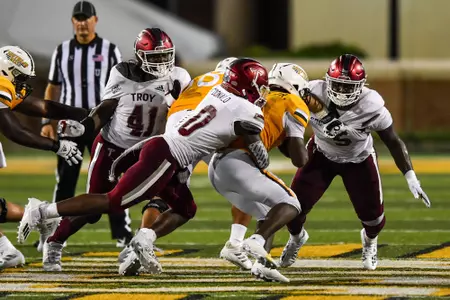 2021 (Sophomore): One of Troy’s leading tacklers before a season-ending ankle injury at Coastal Carolina … Averaged 4.6 tackles per game in the seven contests before the injury; finished ninth on the team with 36 tackles despite missing the final 4.5 games of the year … Troy’s second-rated defensive player and rush defender per Pro Football Focus; ranked ninth in the Sun Belt overall (min. 150 snaps) and ninth against the run (min. 150 snaps) … Finished the year with 13 total pressures, tied for sixth on the team … Had a season-high eight tackles with a fumble recovery at Texas State in the game before his injury … Recorded a tackle for loss in five straight games (Liberty thru Georgia Southern); totaled 6.5 stops behind the line during that streak with 1.5 sacks … Intercepted a pass in the season opener against Southern