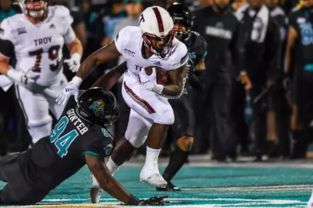 2020 (Freshman): Led the Trojans with 57.3 yards per game and four touchdowns on the ground … Averaged 3.83 yards after contact, which ranked second nationally among all freshmen running backs … Ranked 21st nationally (min. 100 carries) among all running backs with his 3.83 yards after contact average … Named to the All-Sun Belt Team as an honorable mention selection ... Finished the season with 516 yards on 101 carries … Became Troy’s first true freshman to rush for 100-yards in back-to-back games after topping the century mark against Texas State (106) and Eastern Kentucky (143) … His 106-yard game against Texas State was the first 100-yard game by a true freshman at Troy since 2009; he became just the third true freshman in school history to do so … Troy finished 5-1 when he recorded at least nine carries in a game … Rushed 22 times for 76 yards at South Alabama; also caught five passes for 29 yards … Caught 26 passes for 225 yards on the season … Had a season-high seven receptions for 76 yards against Coastal Carolina … Fourth-highest rated running back per Pro Football Focus when it comes to catching the ball out of the backfield with an 83.9 rating – highest in the Group of Five